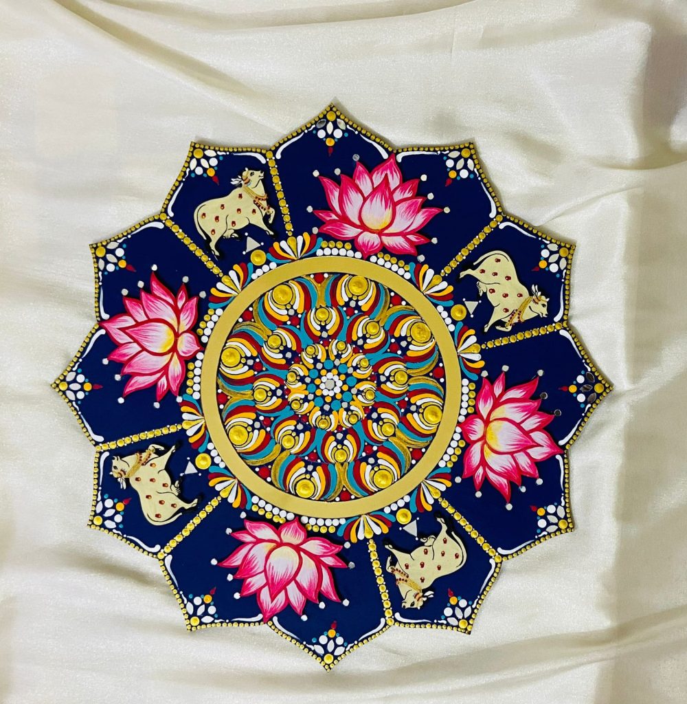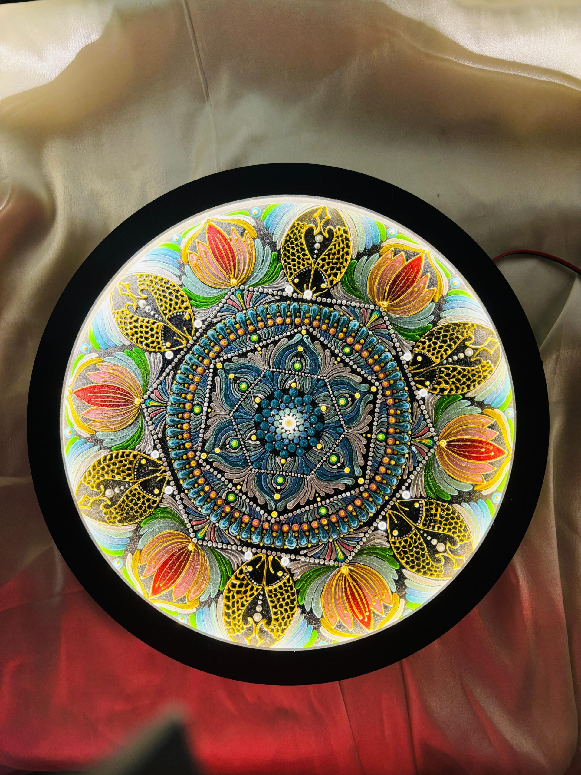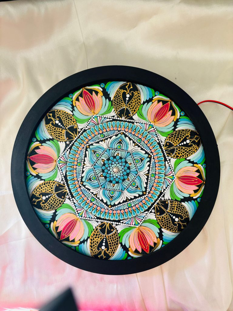 Fish and lotus are very symbolic in Indian culture and are often found in artistic and spiritual manifestations, particularly mandalas. In Buddhism and Hinduism, the lotus is a sacred flower that symbolizes enlightenment, purity, and rebirth. Its bloom in muddy waters represents overcoming life’s obstacles to reach a better state of life. Frequently portrayed in couples, fish are seen as representations of wealth, fertility, and transformation, symbolizing the organic flow and diversity of life.