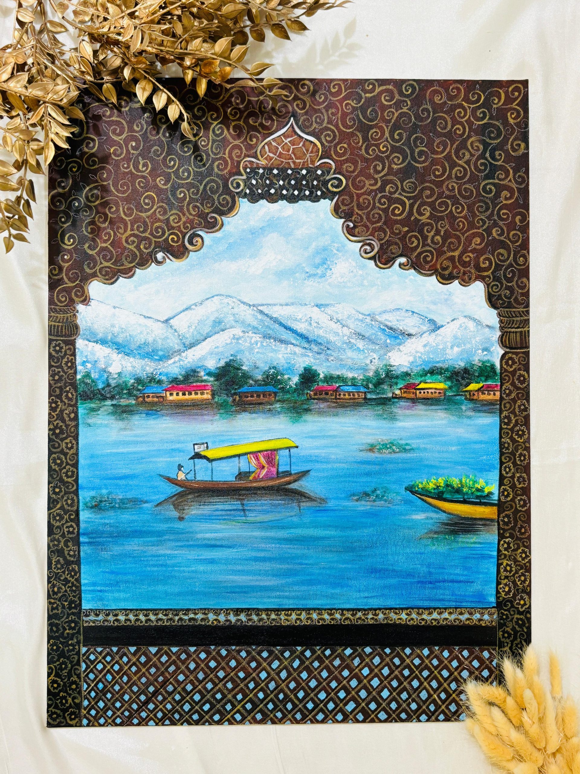 This painting captures the stunning beauty of Dal Lake in Srinagar. The lake reflects the blue sky and fluffy clouds, surrounded by tall mountains. Colorful shikaras, traditional boats, float peacefully on the water, adding to the scenic view. Snow-capped mountains in the distance complete the breathtaking scene.
