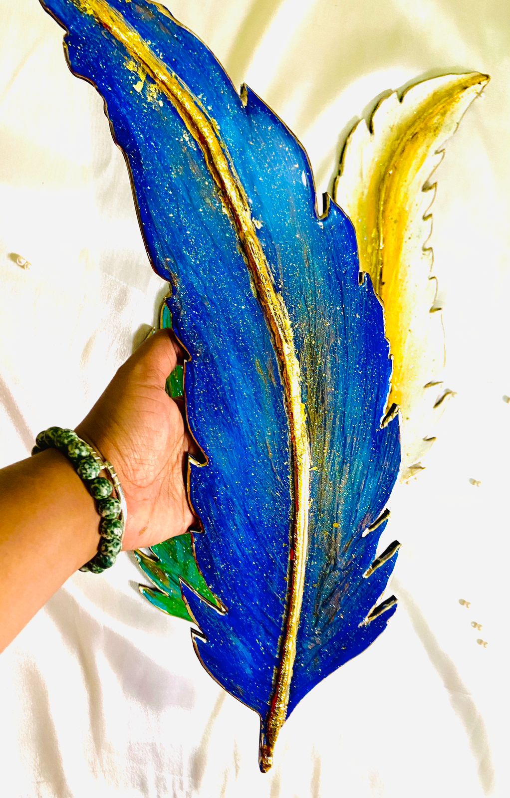 Experience the enchantment of nature with our exquisite set of three leaf art pieces. Each piece, measuring 16 inches, is intricately crafted on a sturdy wooden base, ensuring durability and a touch of rustic charm. Employing a unique technique of resin fusion with mixed media, these artworks beautifully capture the essence of the forest.