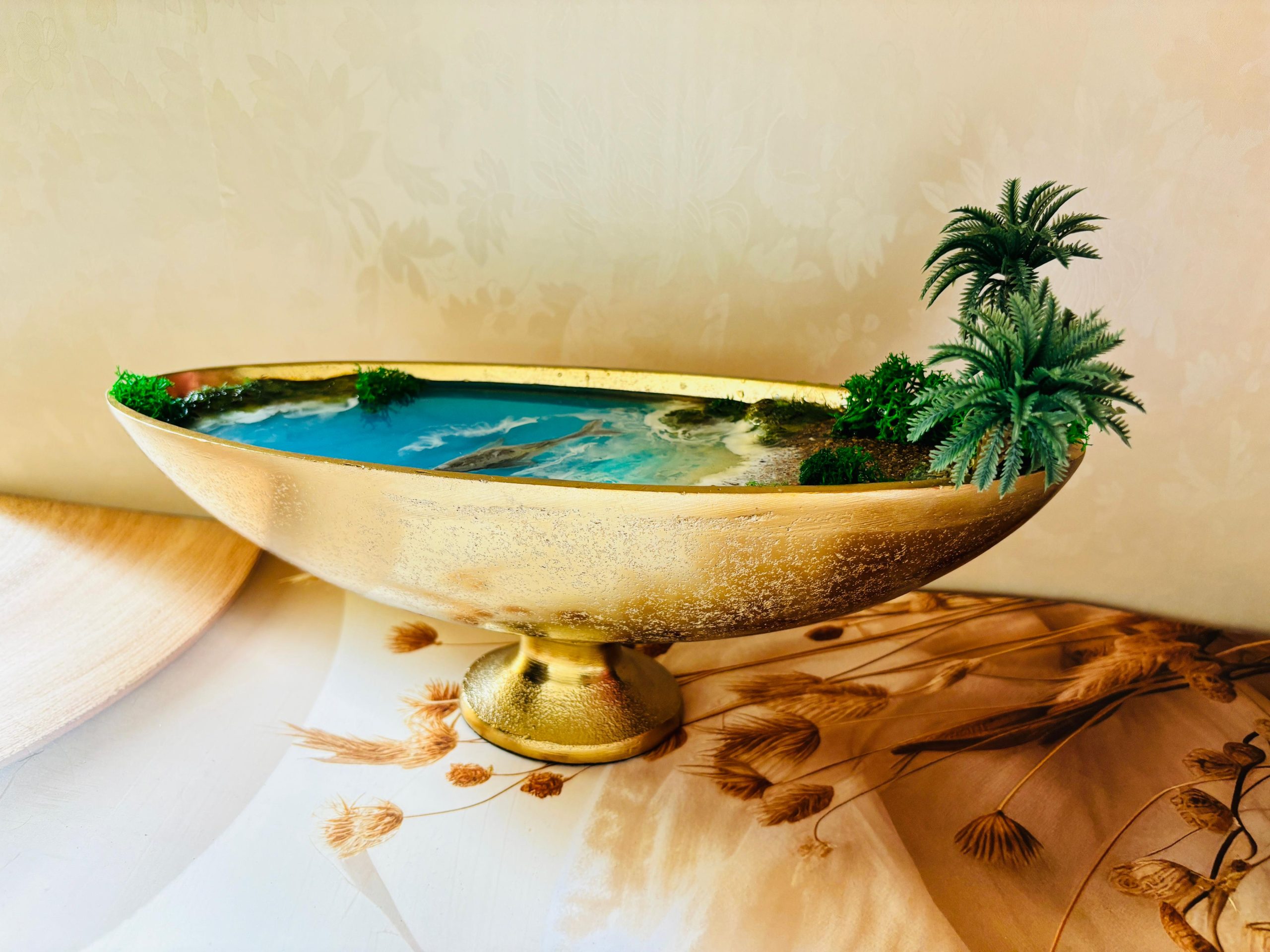 This stunning resin art piece, crafted within a brass ship-shaped bowl, captures the serene beauty of an ocean voyage. At the heart of this miniature seascape is a whale gliding gracefully through vibrant blue waters, surrounded by waves crashing against the shore. The natural elements of sand, moss, and greenery add a touch of realism, evoking the essence of a tranquil beach.