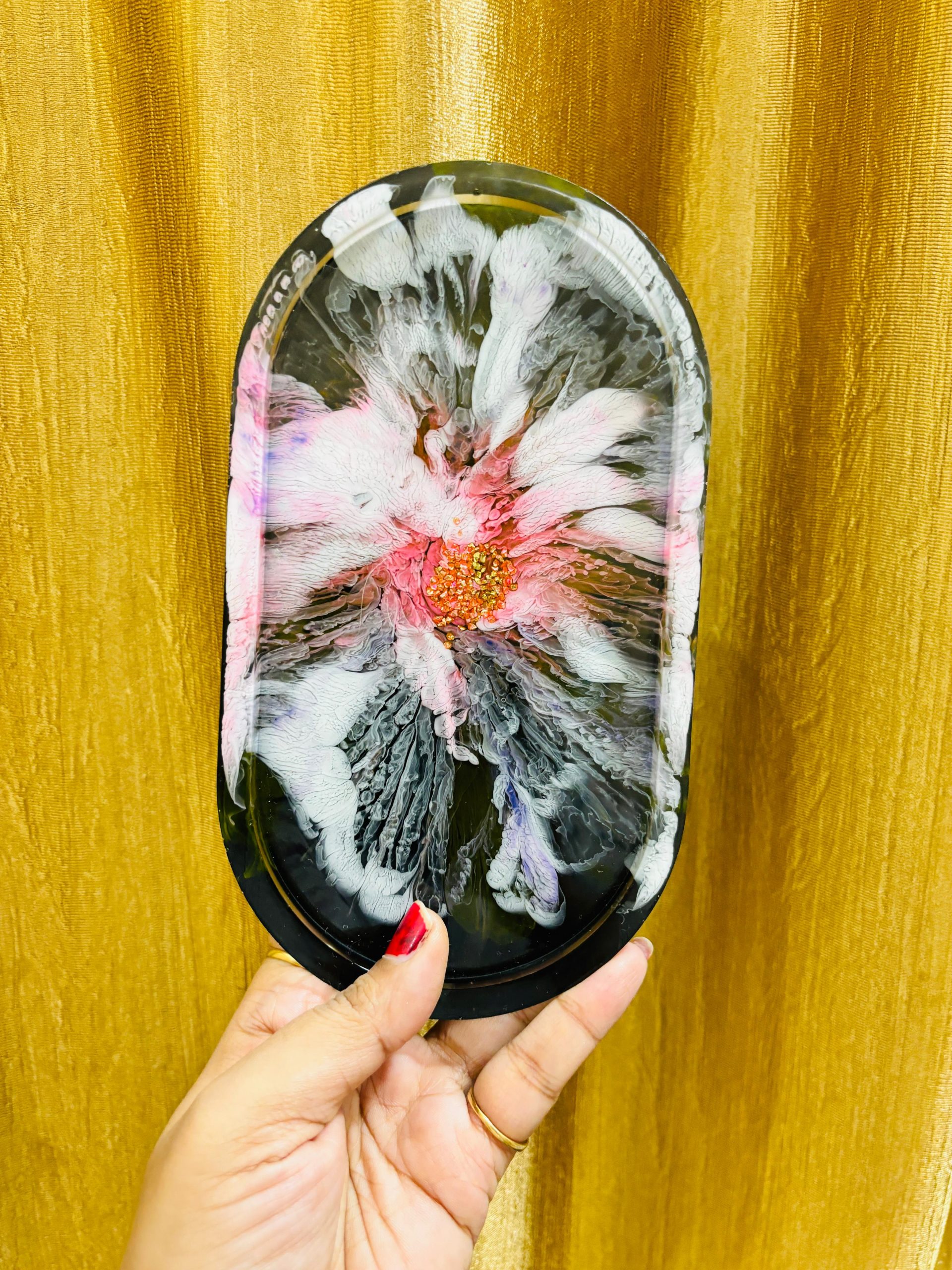 Black. Trinket tray has a floral pattern in white and pink alcohol inks with golden chunks at the centre. Perfect for gifting, for putting any kind of accessories or just to decorate any interiors.