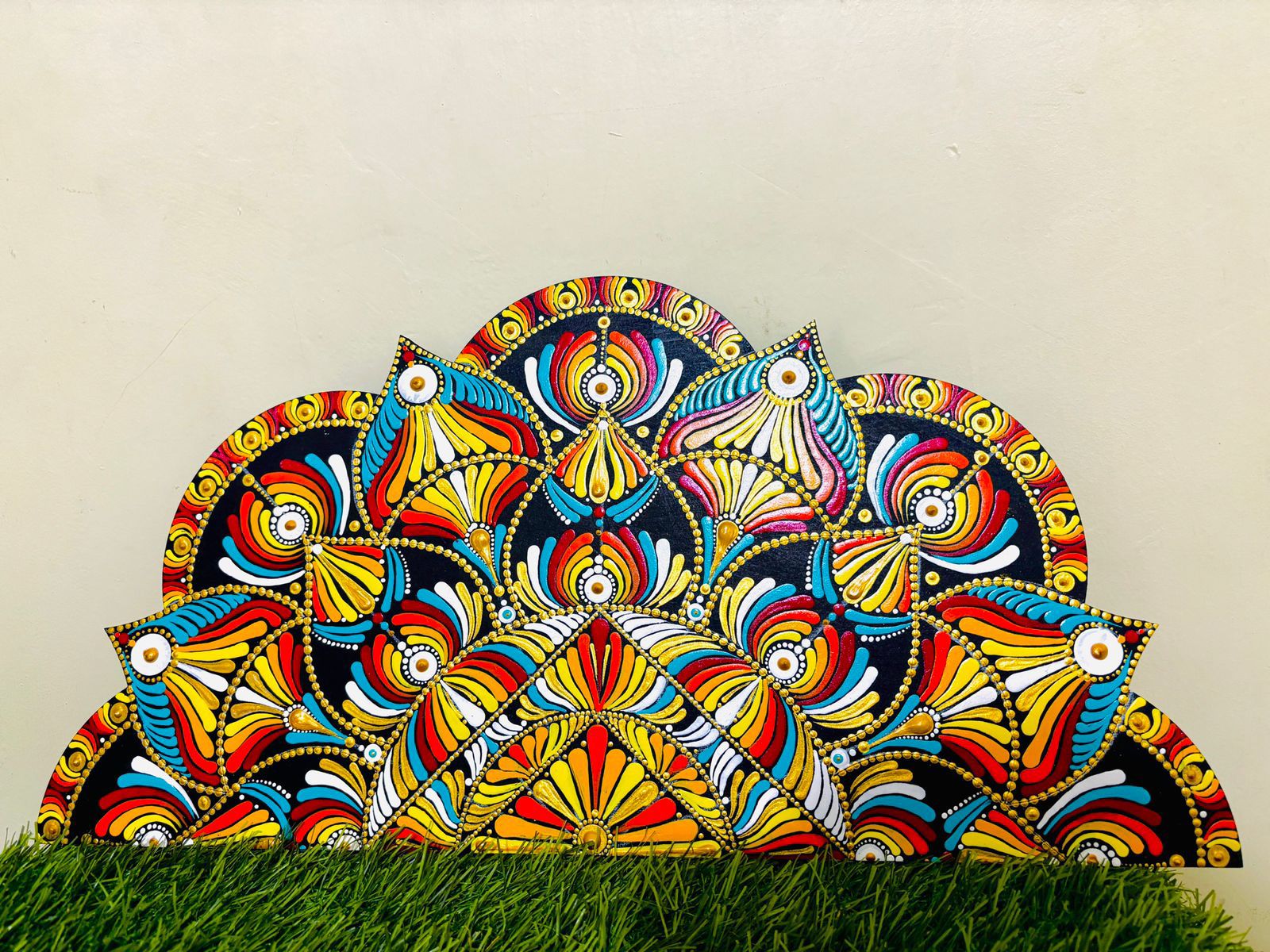 This painting feature the semi-mandala patterns radiate from a central point, creating a symmetrical and harmonious composition. The use of dot mandalas adds a mesmerizing texture and depth to the artwork, with each dot placed to form intricate geometric patterns. The yellow, orange, and red colors blend seamlessly, symbolizing warmth, energy, and creativity.