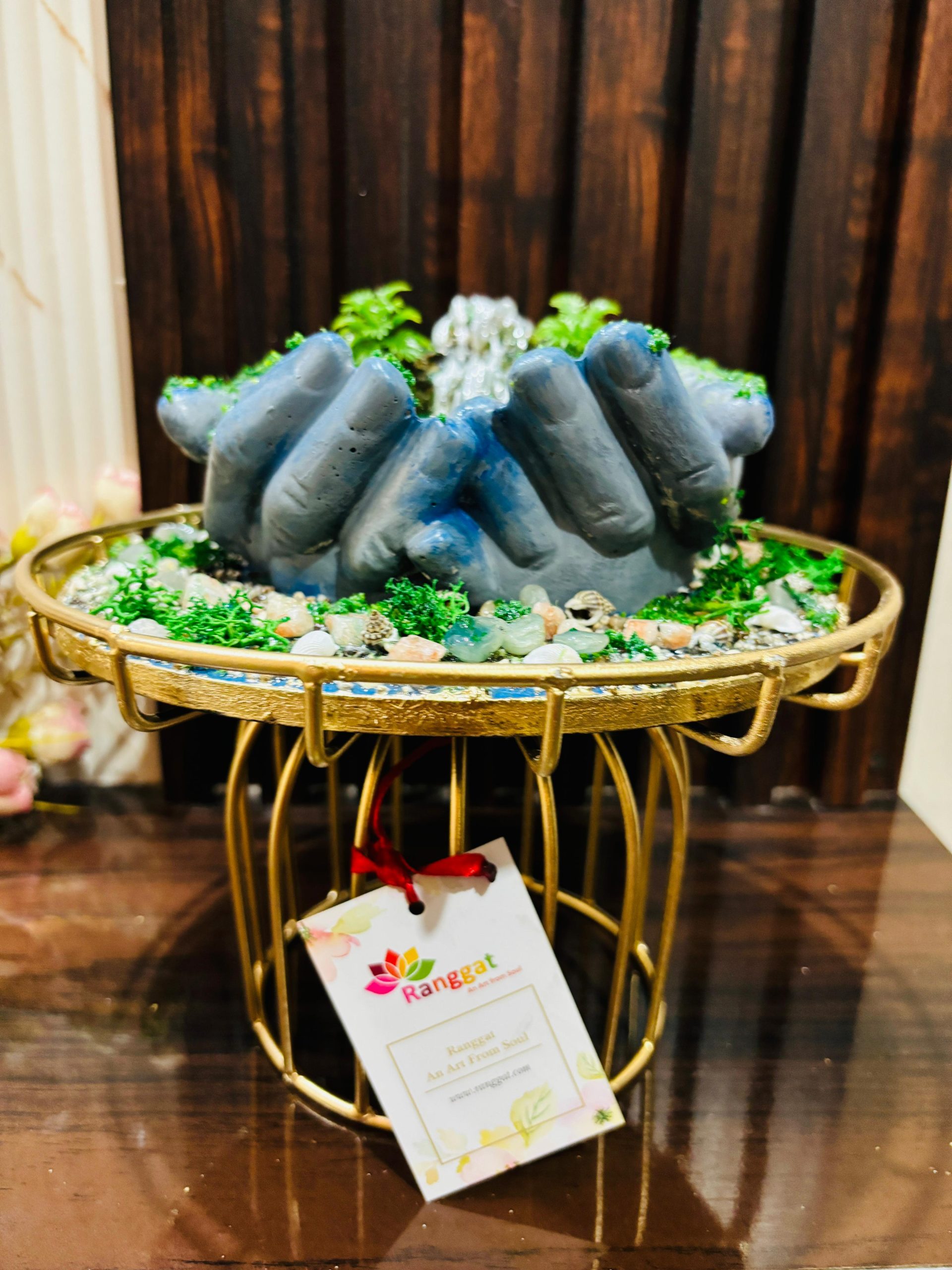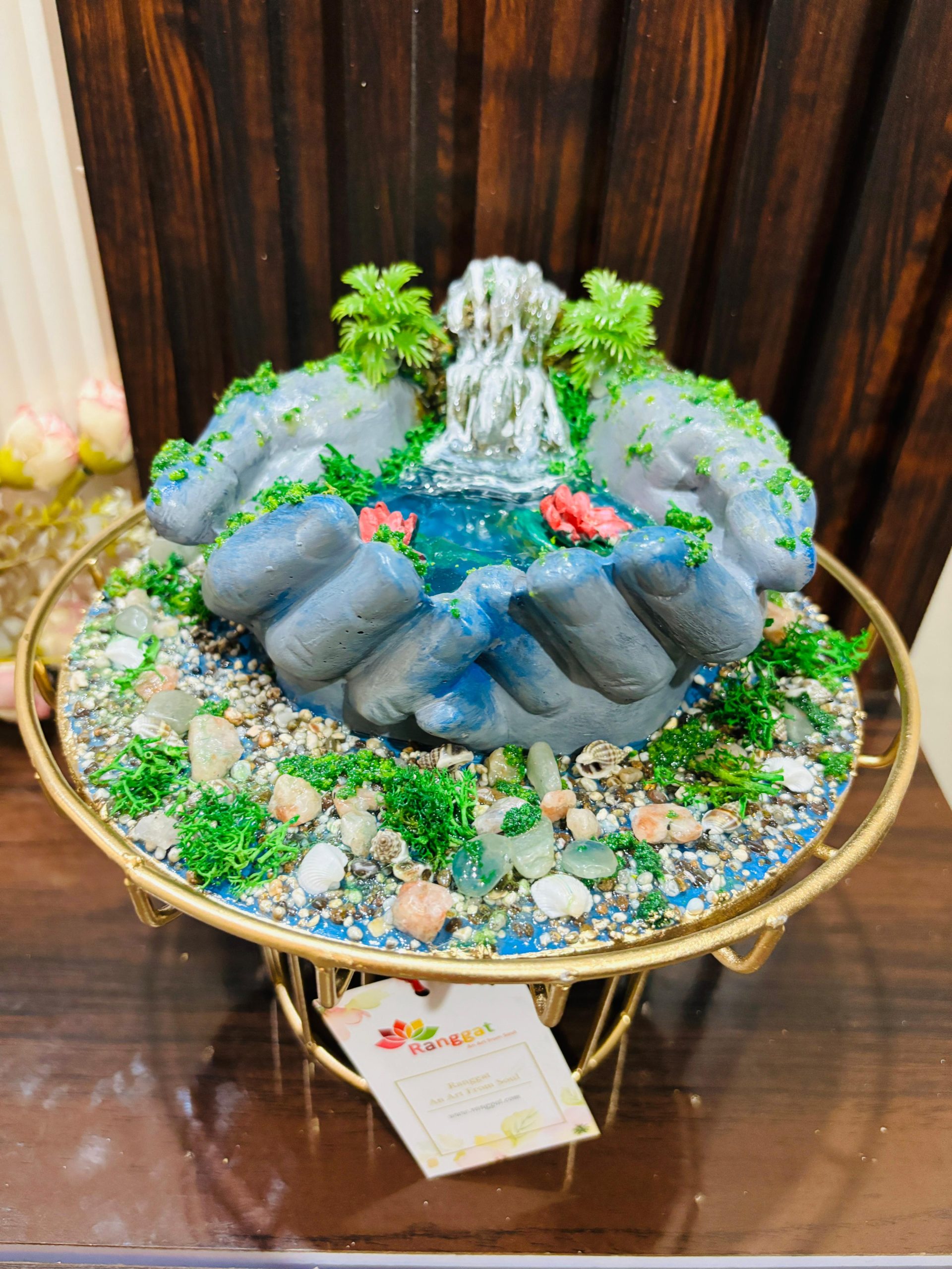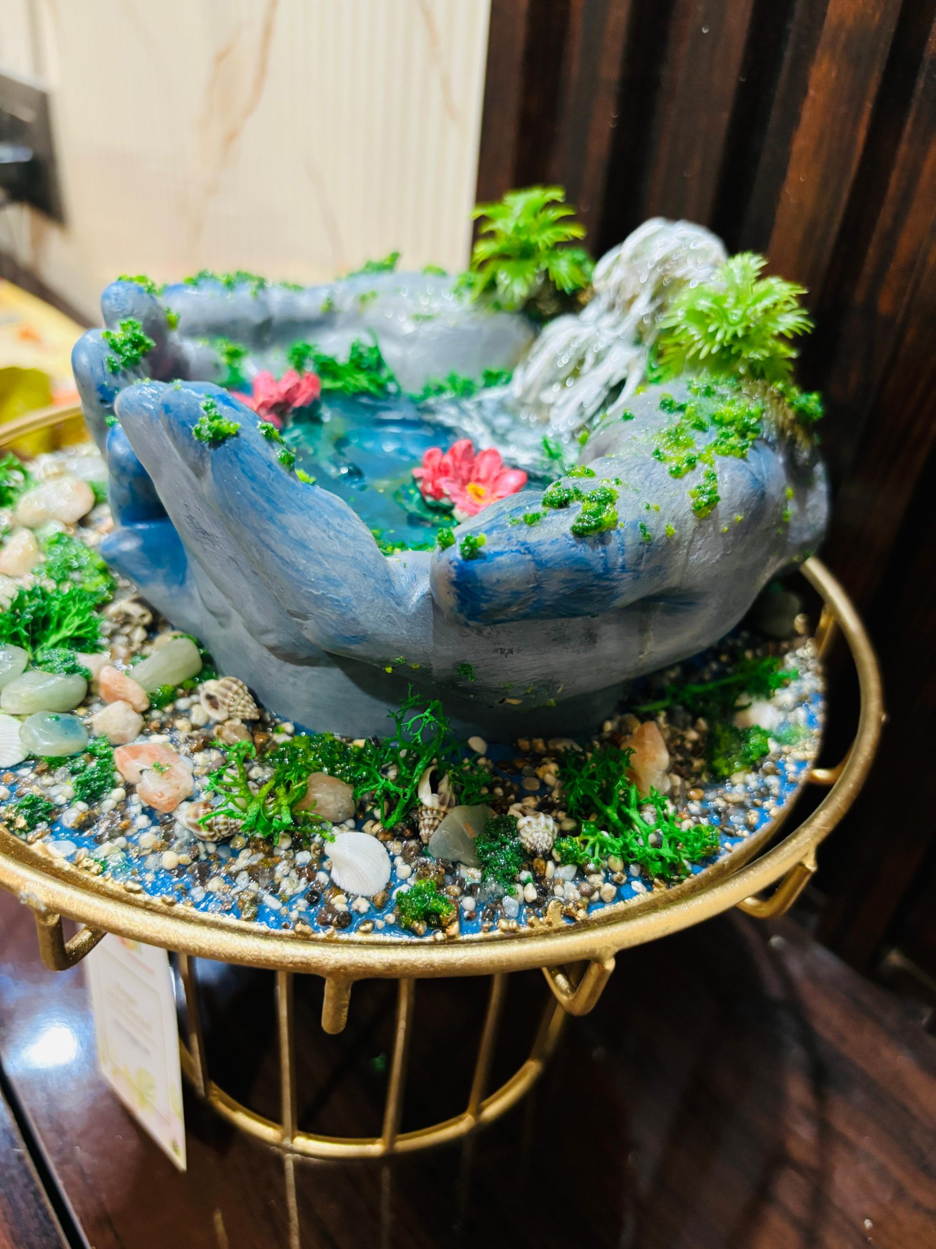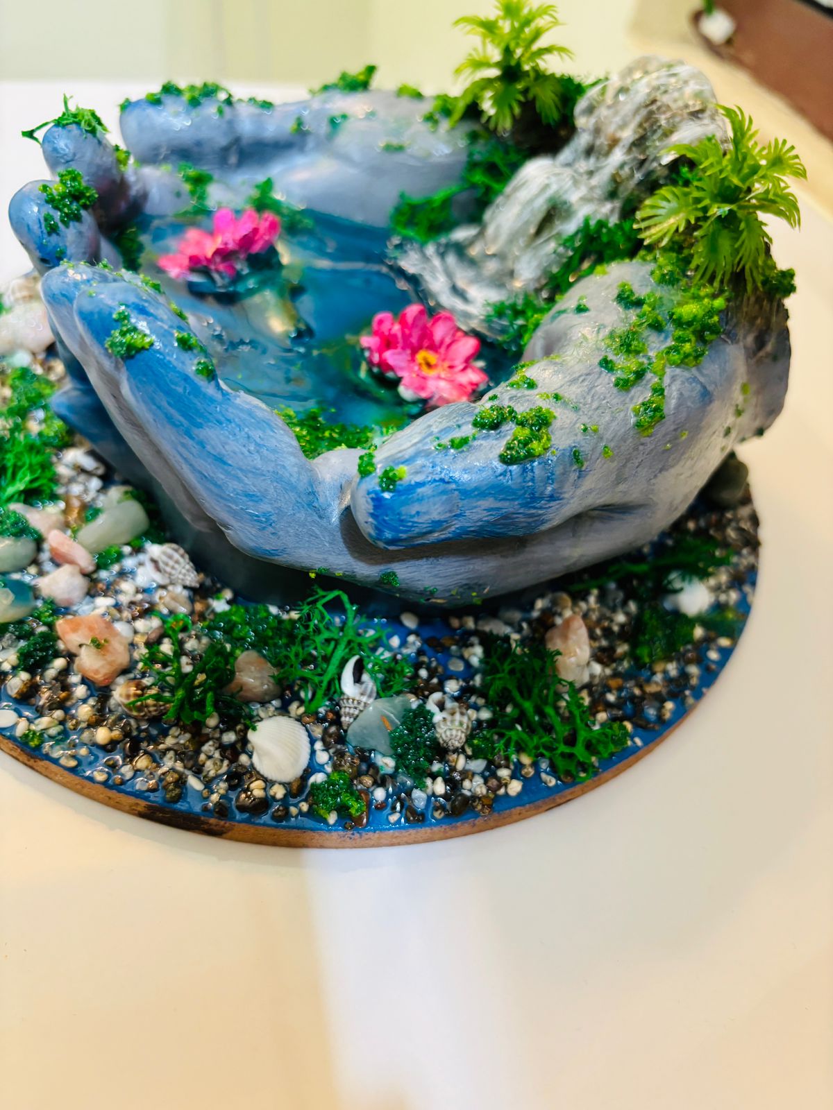 This resin artwork shows a calm and peaceful nature held in two hands. A small waterfall flows into a pond, which has two bright pink lotus flowers floating on the water. Around the hands, there are pebbles, shells, and green plants, making it look like a tiny garden. The details of the water, rocks, and plants make the piece feel real. It represents the idea of nature being protected and cared for, bringing a sense of calm and balance.