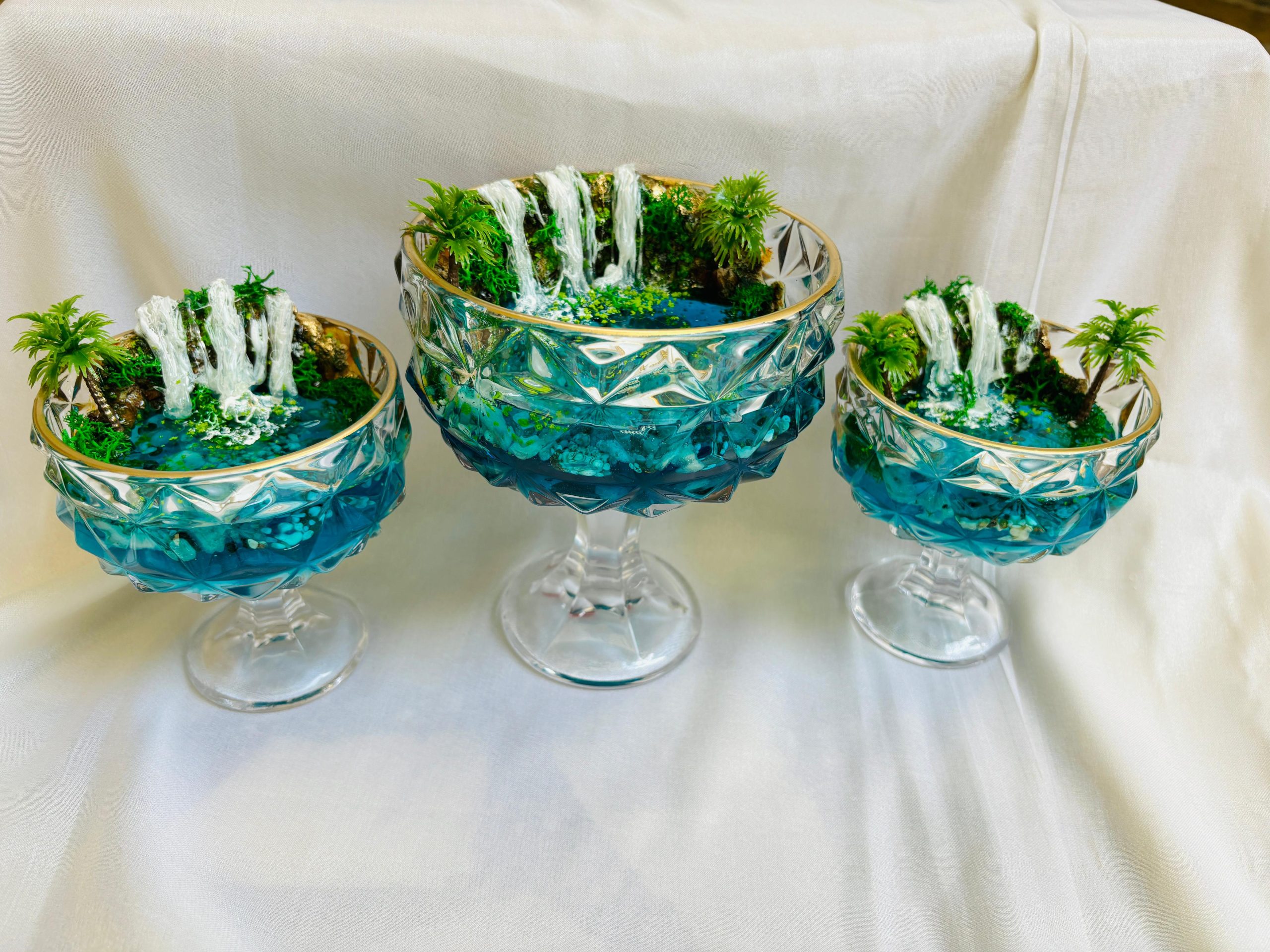 This artwork captures the serene beauty of a waterfall scene in a miniature glass display. Cascading water flows gracefully down rocky cliffs, creating a sense of movement and tranquility within the confined space of the glass.